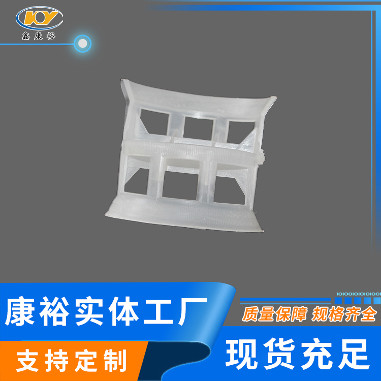 塑料共軛環(huán)結(jié)合了環(huán)形和鞍形填料的優(yōu)點(diǎn),采用共軛曲線肋片結(jié)構(gòu),兩端外卷邊及合適的長徑比,填料間或填料與塔壁間均為點(diǎn)接觸,不會產(chǎn)生疊套。孔隙均勻,阻力小,亂堆時取定向排列,故有規(guī)整填料的特點(diǎn)。有較好的流體力學(xué)和傳質(zhì)性能。可用塑料、金屬和陶瓷做成。